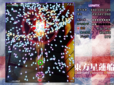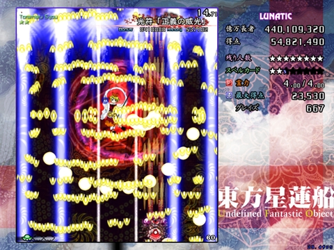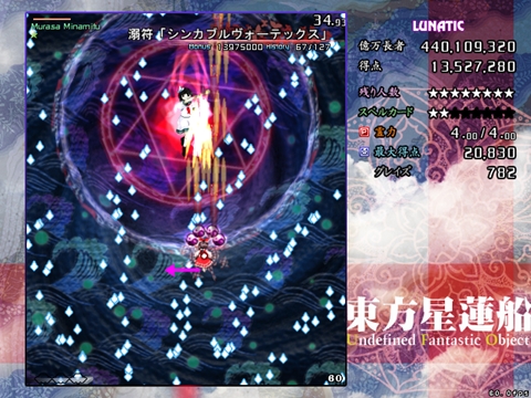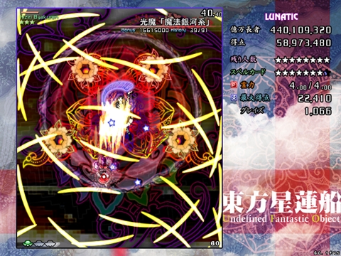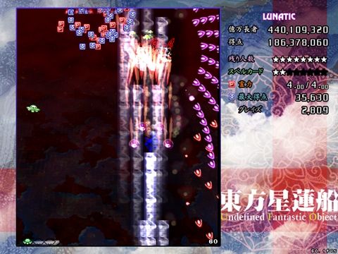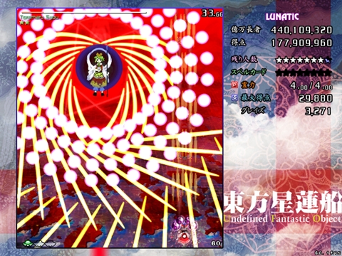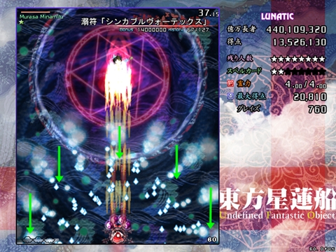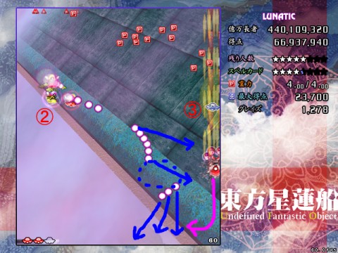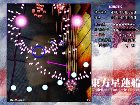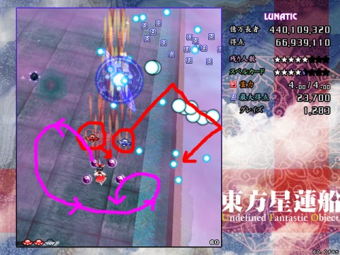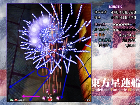 星蓮船最難の声も多いスペカです。ボスが下に降りてきた時は密度が跳ね上がります。また菱形弾がばらけた場合は非常に避けにくいため、究極的にはプレイヤーの運と気合次第になってしまう弾幕ですが、それでも避けの方針はある程度持っておいた方がいいです。