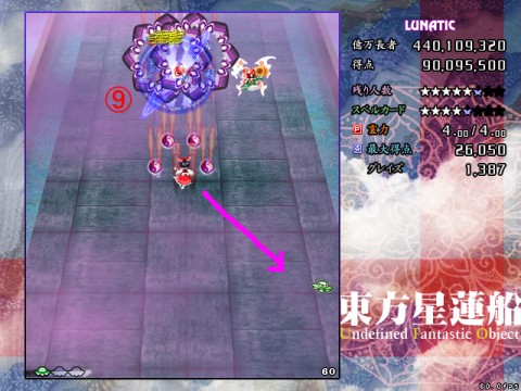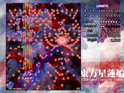 Hardまでは真下で撃ち込んでいる状態からそのまま避けに入っても大丈夫な場合が多いですが、Lunaticでは撃ち込みから避けに移行する前に、これから移動するのとは逆の方向に動いてから入るとよいです。例えば上の画面では、真下で撃ち込んでそのまま右に避けていくのではなく、最初の大玉を左に動いて避けてから右に抜けていってます。