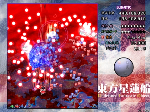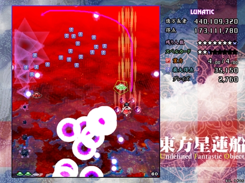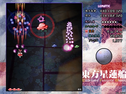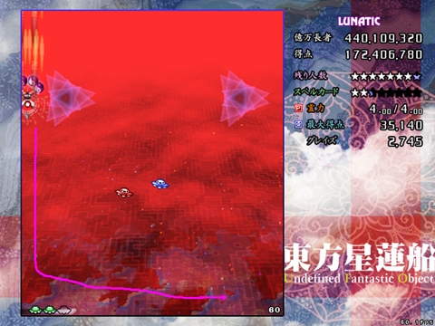 ノーミスパターンでは赤UFO1回、緑UFO3回、虹UFO1回で残機6、ボム6欠片1